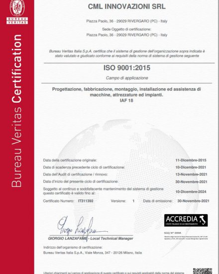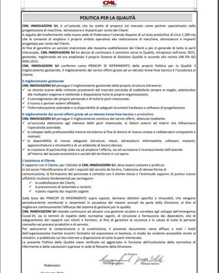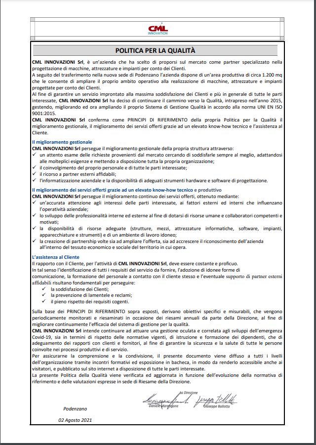 CML Innovazioni crede fermamente nella qualità e nei processi di costante miglioramento dell’azienda.
